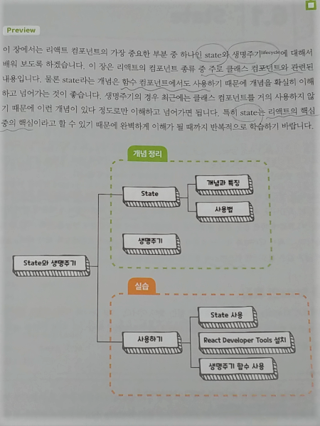 각 장은 프리뷰, 내용 설명, 실습, 요약으로 이루어져 있습니다. 모든 장이 같은 구성 즉, 패턴을 반복합니다. 읽어갈수록 패턴에 익숙해지는데 이게 새로운 내용을 접하는데 꽤 도움이 됩니다.